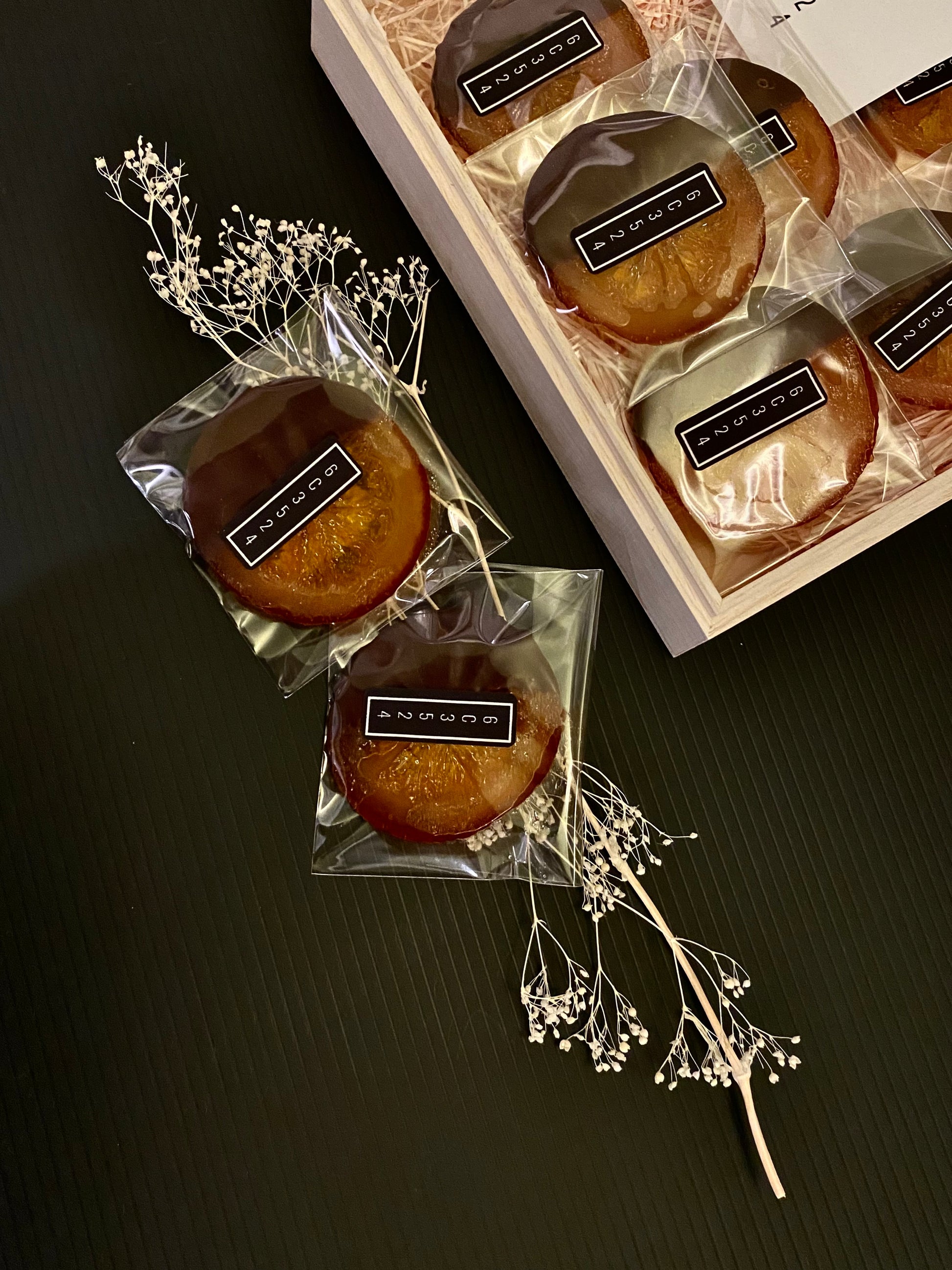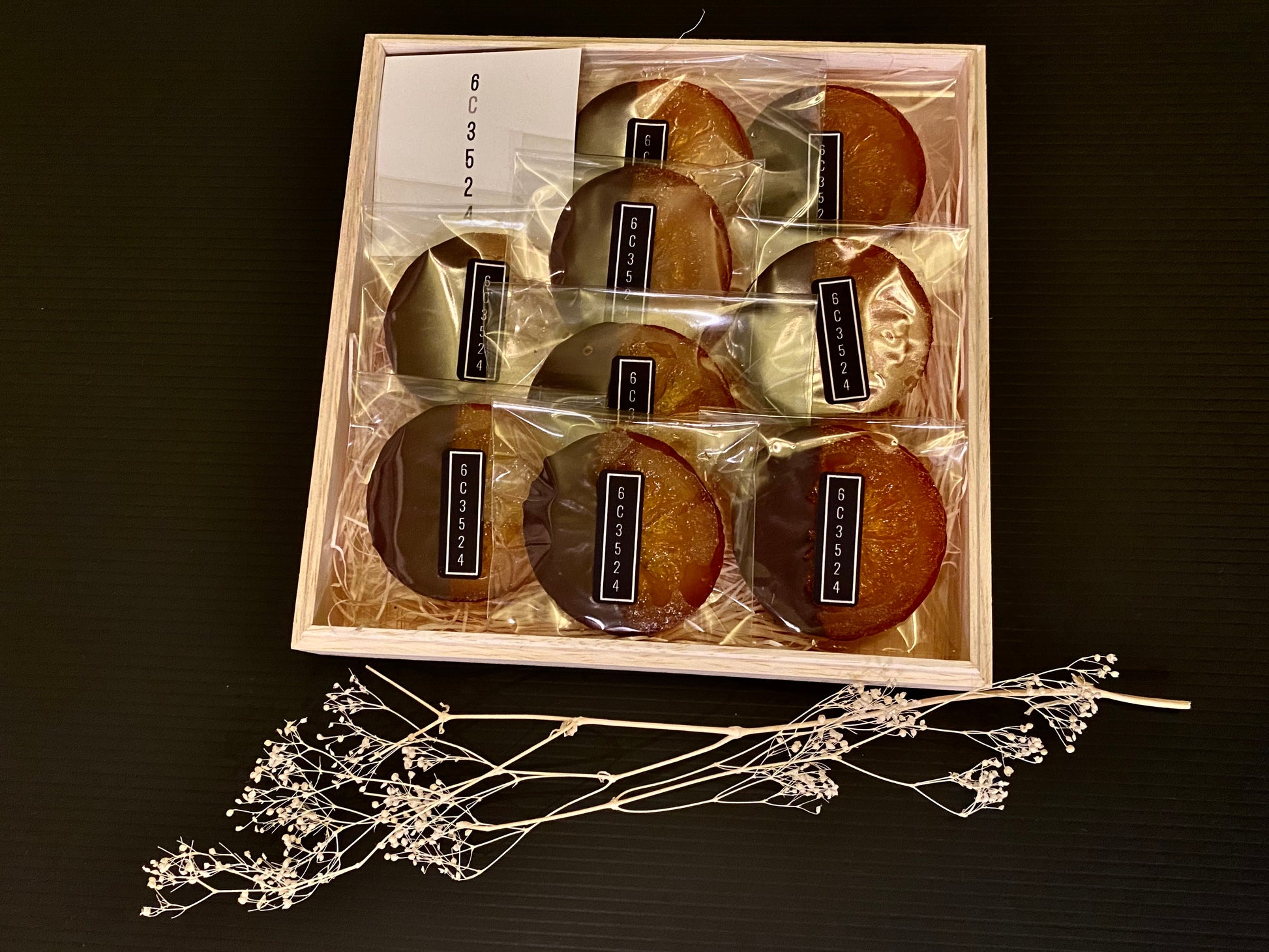 原材料:オレンジ、ダークチョコレート(カカオニブ、きび砂糖)グルコースシロップ(小麦を含む)、砂糖